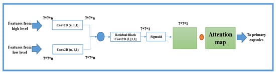 The output feature matrix is extracted from the CapsNet high and low convolutional layer and then passed to the attention feature map (Figure 3). The objects at all levels are then combined and transferred to the residual network for achieving a convolution and a standard map of objects.