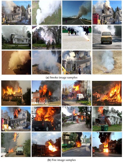 High-quality fire and smoke datasets are extremely rare and, when open for public use, they are generally of low quality for evaluating and analyzing the proposed methods. Therefore, we mainly collected data from various internet resources to test it on our model. The primary size of our data was from pixels from 512 × 512 images. The datasets contained three main parts: smoke, fire, and negative images. For training and testing, each section contained 4000 images. Table 1 lists the information on a number of all images, as shown in Figure 4, below. We trained and tested the proposed model using our datasets collected from different sources. In total was used 12.000 images. Many of them were opened by the owners for use, and some of them that needed some copyright issues were asked permission for using in our research.