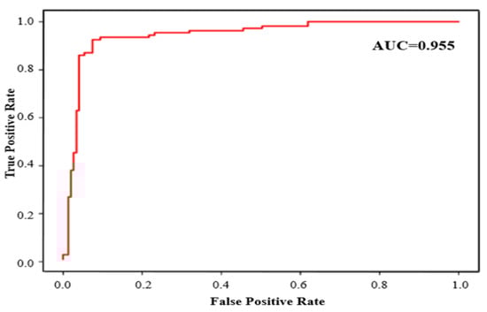 The power of classification of the models was measured based on the receive operating characteristic curve (AUC) area, which is considered a significant metric to demonstrate the effectiveness of a classification by means of changing the threshold of discrimination. A Matthew Correlation Coefficient (MCC) is another indicator of binary (two-grade) classifications quality. The MCC is used to consider the relationships of balancing the four confusion matrix categories, i.e., TP, TN, FP, and FN, and objectively reflects the models′ predicting power without being influenced by the disproportionate ratio of positives and negatives contained in the dataset. Equation (17) is used to calculate the MCC: