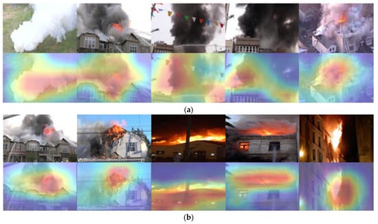 Results of attention feature map using CapsNet for fire classification: (a) smoke classification results, (b) fire classification results, and (c) negative image results.