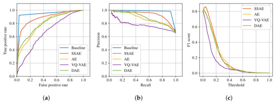 The generated ROC curves and precision/recall curves are shown in Figure 4a,b, respectively. For the autoencoder models, the generated F1 score curves with normalized thresholds are also shown in Figure 4c. The ROC curve and precision/recall curve show that SSAE has the best performance compared with the other autoencoder models.