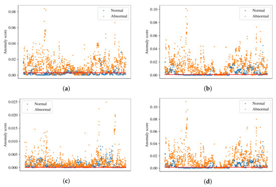 The distribution of normal and abnormal samples in the test dataset is shown in Figure 5. In the figure, blue dots correspond to normal samples, orange dots correspond to abnormal samples and red lines represent the thresholds found by optimizing the F1 score. For a good anomaly detector, normal samples should be placed below the threshold line and abnormal samples above the threshold line. The results in Figure 5 support the performance results stated earlier. It can be clearly seen in Figure 5c that VQ-VAE has trouble classifying normal and abnormal samples, since the anomaly scores of a significant number of those samples fall within the same range. However, abnormal samples have higher anomalies scores in general. On the other hand, Figure 5b,d shows that AE and DAE have a good ability of distinguishing between normal and abnormal samples. The SSAE has the best ability to distinguish between the samples, where the majority of normal samples is below threshold and the majority of abnormal samples is above threshold.