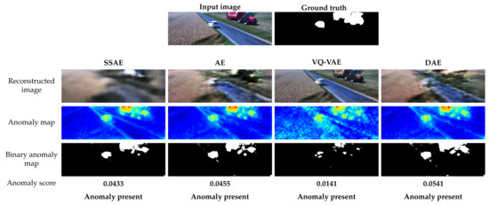 The qualitative performance of the autoencoder models is presented in Figure 6. The example image is captured by the front camera of the combine harvester during field operation. In this scenario, the tractor with a trailer and the car are potential obstacles in the harvester’s path and should be detected as anomalies. The reconstruction images show that the different autoencoders are reconstructing the images as expected. For SSAE, there is significant difference in the reconstruction of normal and abnormal areas. The AE and VQ-VAE models are reconstructing anomalies poorly, while DAE is able to remove the anomalies from the image. The anomaly maps of SSAE, AE and DAE show the anomalies clearly. However, the anomaly map produced by SSAE has smoother normal areas. The anomaly map generated by VQ-VAE has significantly more noise in areas without anomalies. The anomaly scores are above the threshold for all four autoencoders, indicating that the image would be correctly classified as anomalous in all cases.