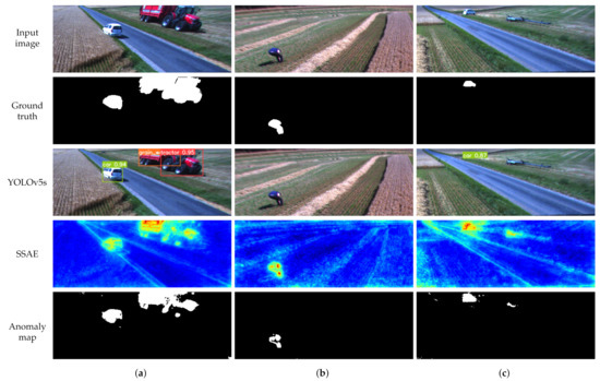Comparing anomaly detectors with the baseline YOLOv5 model, it can be seen from Figure 4 and Table 4 that SSAE has the closest performance to the baseline model. One major difference between the anomaly detectors and object detector is that anomaly detectors do not provide class labels for the detected objects. Another major difference is the requirements for the training dataset. For example, AE and VQ-VAE require only normal data that does not need to be annotated. On the other hand, SSAE requires a small number of annotated samples. Furthermore, DAE requires annotated masks for objects, which can be time-consuming. Although object detectors provide class labels for anomalous objects, they require a large amount of data for each object class. Given that the agricultural fields are highly unstructured environments, it is unrealistic to collect enough data for each object that could potentially be found in a field. For example, Figure 7c shows a header trailer that was not included as a class for annotation. YOLOv5s cannot detect it as an object, but SSAE can detect it as an anomaly. Moreover, Figure 7b shows a scenario where YOLOv5s fails to detect a person because of their body position. In the same scenario, SSAE is able to detect a person as an anomaly successfully.