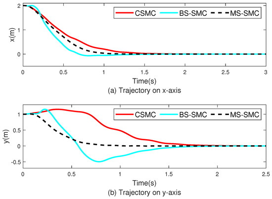 As the advantage of conventional sliding mode control (CSMC) is that it can overcome the uncertainty of the system, it has robustness to disturbances and un-modeled dynamics [8,9,10]. In particular, it has a good control effect on nonlinear systems. Moreover, with the simple sliding mode structure algorithm, rapid response speed, robustness to external noise interference, and parameter perturbation, CSMC has been widely used in the field of quadrotor control. However, it is difficult for initial state to slide strictly along the sliding mode surface as it zigzags to approach the equilibrium point for a linear surface. The insecure sliding property cannot allow states to reach equilibrium within a finite time [11]. Therefore, Xiong created a terminal SMC [12]. However, the terminal sliding mode itself has a shortcoming of the singular problem [13]; hence, a nonsingular terminal sliding mode has been proposed to solve this problem in [14,15,16]. In [17], a fast terminal sliding mode control method for rigid manipulators was developed to achieve high accuracy tracking control. Based on this, a full-order end-sliding-mode control strategy was proposed to solve the chattering problem in [18]. Based on hybrid sliding mode algorithms, a fully robust back-stepping sliding mode controller has been constructed for both position control and attitude control [19,20]. In [21,22], an adaptive controller has been presented for attitude and position tracking based on combined integral sliding mode control, and the radial basic function neural network method, respectively. The unknown parameters are estimated through online using the neural network algorithm, requiring intensive computation. Hence, there exists a limit to be used for compact UAVs. For low-cost devices in measurement and control, a research suggested an accurate and economical method of estimating information on drone sensors [23]. As suggested in [23], if an advanced controller replaces the classical PID controller, a quadrotor with outstanding performance can be presented. In this study, we designed an SMC that enables quickly tracking and stabilizing the quadcopter. In general, quadrotor motion dynamics can be derived via the Newton–Euler and Euler–Lagrange methods. The Newton–Euler formalism provides physical insights through derivation. The Euler–Lagrange formalism provides the linkage between the classical framework and the Lagrangian or Hamiltonian method [24]. Herein, the dynamics of the quadrotor were formulated based on the Euler–Lagrange approach. The control input can be obtained through the SMC. The desired angle () can be derived from the target position and control input. To provide rapid stability and trajectory tracking, a nonlinear sliding mode plane was designed to reduce the time to reach equilibrium. Moreover, dual-loop control [21,25,26] is used to design the control law, in which the attitude subsystem is the inner loop, and the position subsystem is the outer loop. The intermediate command signals and generated by the outer loop must be transmitted to the inner loop subsystem. The inner loop subsystem tracks two transmission signals through SMC. In dual-loop control, the attitude-angle tracking error of the inner loop system affects the stability of the outer loop, which induces the stability of the entire closed-loop control system. The stability problem is related to the inner and outer loop control, as the dynamic performance of the inner loop and the attitude-angle tracking error affect the stability of the outer loop, especially for an initial error, and, consequently, affect the stability of the entire closed-loop [27,28]. In this paper, position information is assumed to be detected by a three-axis accelerometer and is compared with location information of a virtual GPS. Attitude information is assumed to be detected through a three-axis gyroscope and compared with the desired angle values () generated by the position controller. To improve the flying performance of the quadrotor, various sensors are mounted on the structure. Recently, a vision sensor was used to provide accurate location information. In addition, the altitude of quadrotor is precisely detected through a rangefinder to improve landing performance. Accurate attitude information is obtained through an additional inertia measurement unit along with gyroscope. Continuous direction update of quadrotor can also improve flight performance by using a magnetometer [29,30]. The simulation compared the performance of CSMC, BS-SMC, and MS-SMC presented in this paper. Position control and attitude subsystem control were performed under various conditions. Disturbance was applied to determine the robustness of the controller. Compared to CSMC and BS-SMC, MS-SMC reached the desired target with more stable performance and confirmed the lessened sensitivity to disturbance. In addition, the reaching speed of MS-SMC being faster than CMSC and BS-SMC shows that the modified sigmoid function designed in this paper functions properly.