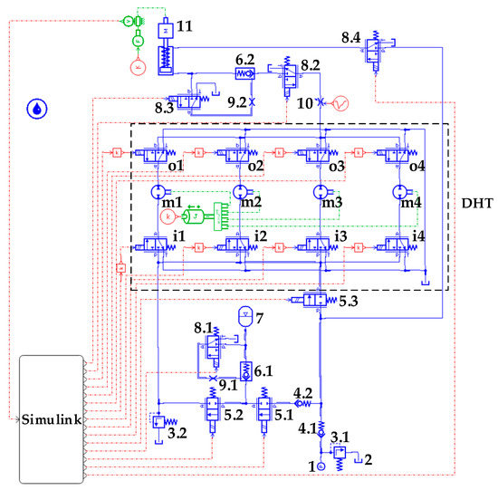 Figure 4 shows the physical model of a digital speed-regulating traction hydraulic control system based on DHT. This model is constructed via joint simulation of AMESim and Simulink. To verify the rationality of the traction hydraulic system circuit design, we first adopted the control method of digital logic combination to encode and control eight solenoid directional valves to verify the feasibility of the DHT pressure transformation principle.