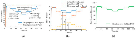 In accordance with the power on/off controls of the matrix (13), the pressure, flow, and rotational speed of DHT in the hydraulic system are depicted in Figure 7. As shown in Figure 7a,b, the input pressure of oil port P is constant and the output pressure of oil port A is changed in a stepped state. DHT realizes the function of decreasing pressure regulation. When DHT is regulated by decreasing pressure, the difference value between the output flow qo at oil port A and the input flow qi at oil port P is the flow qt of the tank into oil port T, achieving the objective of decreasing pressure and increasing flow.