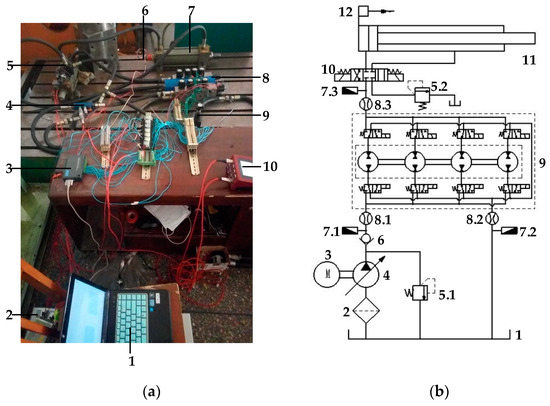 Experimental simulation platform of the hydraulic traction system. (a) Physical diagram of the experiment platform. (1) Measurement and control system. (2) Direct current power. (3) Data acquisition card. (4) Flow/pressure sensor. (5) Three-position, four-way solenoid directional valve. (6) Displacement sensor. (7) Hydraulic cylinder. (8) DHT. (9) Relief valve. (10) Flow/pressure gauge; (b) Hydraulic schematic of the experimental platform. (1) Tank. (2) Filter. (3) AC motor. (4) Constant-pressure variable displacement pump. (5) Relief valve. (6) Check valve. (7) Pressure sensor. (8) Flow sensor. (9) DHT. (10) Three-position, four-way solenoid directional valve. (11) Hydraulic cylinder. (12) Displacement sensor.