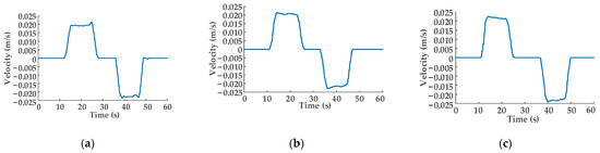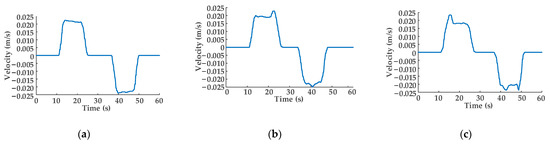 Speed variation curves of the hydraulic cylinder piston rod: (a) output pressure of the constant-pressure variable pump is 7 MPa; (b) output pressure of the constant-pressure variable pump is 6 MPa; (c) output pressure of the constant-pressure variable pump is 5 MPa.