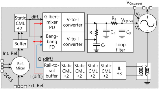 We employed an integer-N PLL considering its simplicity and robustness. To achieve a fast settling time, the reference frequency was chosen to be relatively high by setting the modulus N = 48. The divider chain is composed of five stages to achieve the desired modulus. Different divider structures were employed along the chain to achieve proper frequency division at different frequency regimes. The schematic of the divider chain is depicted in Figure 10. There are three divider topologies popularly used in the millimeter-wave and microwave regime, which include injection-locked (IL) dividers, Miller dividers, and static current mode logic (CML) dividers. Among them, the IL topology achieves the highest frequency operation due to its injection locking mechanism [33]. Hence, the first stage is realized as an injection locking divide-by-three divider (ILFD) to deal with a high-frequency input at the W-band generated by the VCO. An inductive feedback network was employed for transistors M1 of the ILFD as shown in Figure 10a to enhance its locking range. This technique was demonstrated to improve the fractional bandwidth of the ILFD up to approximately 11% [27]. Since the ILFD required a specific level of input signal for a proper locking operation, which is simulated to be around 0-dBm, the VCO output was designed to achieve at least this signal level in the worst condition, with a safety margin considering the process variation.