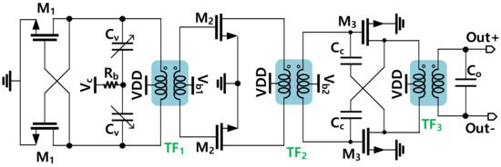 The whole schematic of the cross-coupled VCO with an output buffer is shown in Figure 2. Since the PLL output power is aimed at the milliwatt level for driving the transmitter power amplifier as well as supporting the locking operation of the divider chain, the output of the VCO is connected to a two-stage push-pull buffer to further boost its output power. Thus, it is important to co-design the push-push buffer with the VCO to achieve high efficiency.