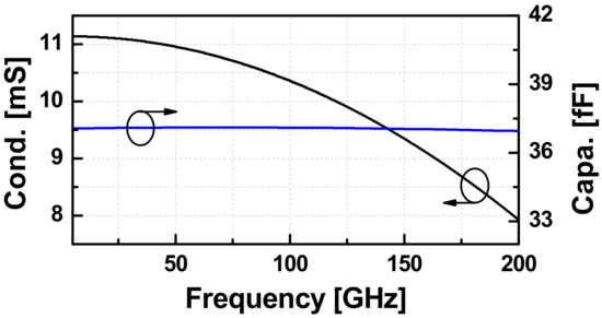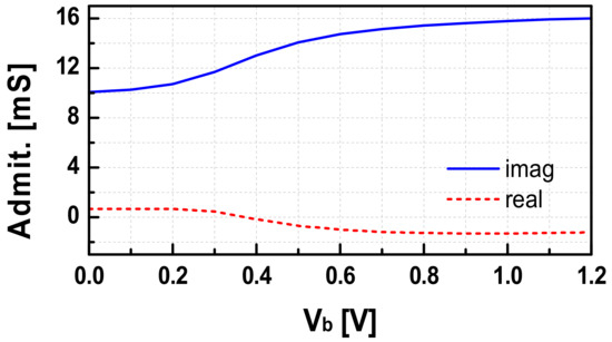 Theoretically, if Cgd is neglected, the input impedance observed from the buffer to the load is only the gate capacitance with its parasitic resistance. Therefore, the expected input admittance of the buffer should be a capacitive susceptance in parallel with a conductance. These values were extracted at 82 GHz with various bias values of Vb1, as shown in Figure 7. As observed, the input susceptance of the first buffer varies largely (~60%) depending on the bias voltage (Vb1) of the gate. Therefore, we can effectively tune the oscillation frequency of the VCO by controlling the gate bias voltage (Vb1) of the first stage of the buffer. In the overall synthesizer, Vb1 is used as the coarse tuning knob (VC(coarse)) to change the output frequency of the PLL while the control voltage of the variable capacitor, Vc, in the VCO is used as a fine-tuning knob (VC(fine)) to tune a proper KVCO value in the PLL locking operation. In this way, the frequency hopping operation of the designed PLL could be effectively achieved without any implementation overhead.