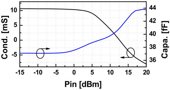 The HBSP-extracted effective capacitance (Cccp) and negative conductance (Gccp) of a CCP with an NMOS the size of 32 μm versus applied input power (Pin) from the 50Ω-port.