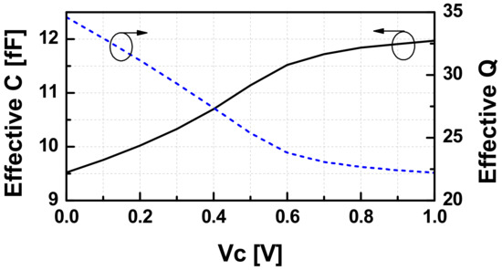 There are three types of variable capacitors available: thin gate NMOS, thin gate PMOS, and thick gate NMOS in the used 65 nm CMOS process. Among them, the thin gate PMOS capacitor has the highest Q-factor with the same fractional capacitance tuning range. Figure 6 depicts the effective capacitance and the Q-factor of the variable capacitor used in the designed VCO.