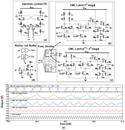 Schematic of the divider chain: (a) the injection-locked FD; (b) the first CML FD; (c) the second, third, and the fourth CML FD; (d) rail-to-rail buffer; (e) A simulation result of the divider chain.