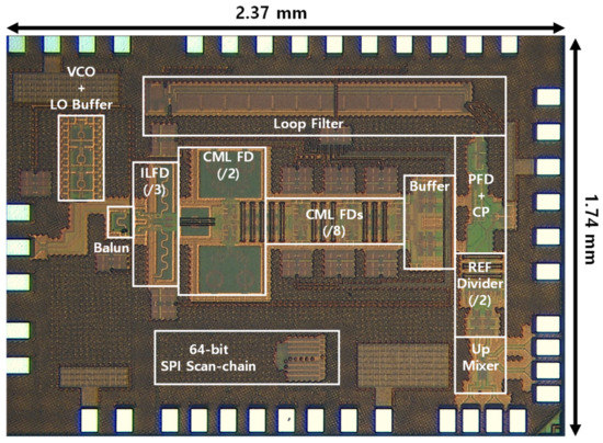 - Nam, H.; Park, J. A W-Band Divide-by-Three Injection-Locked Frequency Divider with Injection Current Boosting Utilizing Inductive Feedback in 65-Nm CMOS. IEEE Microw. Wirel. Compon. Lett. 2020, 30, 516–519. [Google Scholar] [CrossRef]