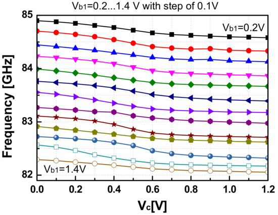 The setups to measure the oscillation frequency (Fosc), phase noise (PN), and the output power (Pout) of the VCO are demonstrated in Figure 14. An 18th harmonic mixer (Agilent 11970W) was used to measure the spectrum of the W-band signal from the VCO by down-converting the VCO output with a LO signal from the signal generator (Agilent 83623B). The intermediate frequency signal (IF) was then input into a spectrum analyzer (E4407B) to measure the frequency and PN performance. The conversion loss of the harmonic mixer and other cable connections was estimated to be around 48-dB or even higher (~50-dB) depending on IF frequency, as estimated in [11]. Figure 15 shows the PN performance of the VCO when Vb1 = Vb2 = 0.7 V, which was read to be −92.6 dBc/Hz and −106.1 dBc/Hz at 1-MHz and 10-MHz, respectively. The phase noise of the signal generator was measured to be −128.3 dBc/Hz at 1-MHz offset and −144.4 dBc/Hz at 10-MHz offset. This means the PNs of the LO signal after being multiplied 18 times are calculated by −103.2 dBc/Hz at 1-MHz offset and −119.3 dBc/Hz at 10 MHz. Thus, the PNs of the measurement setup were still more than 10-dB smaller compared with the measured PNs of the VCO signal at corresponding frequency offsets, which justifies the PN measurement results from the IF of the harmonic mixer. The measured Fosc of the VCO is shown in Figure 16. When the varactor control voltage (Vc) varies from 0-V to 1.2-V and the bias tuning voltage (Vb1) varies from 0.2-V to 1.4-V, the oscillation frequency of the VCO changes from 82-GHz to 84.9-GHz.