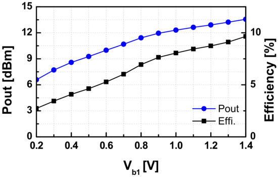 The output power was measured by a W-band power sensor (W8486A) combined with a power meter. The external losses of the probe and the waveguide connections were calibrated from the read output power of the VCO. In the measurement, the output power of the VCO was almost unchanged, as Vc varies. However, it depends on the value of Vb1 as shown in Figure 17. The calculated efficiency from those values is shown in the same figure as well. The measured results of the SA VCO were summarized in Table 2 in comparison with other state-of-art VCOs reported recently [36,37,38,39,40,41,42,43,44,45]. The designed VCO in this work achieved superior output power and high efficiency among W-band CMOS VCOs owing to the efficient co-design of the output buffer.