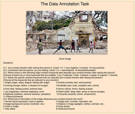 Figure 4 provides a block diagram of the layout of the crowd-sourcing study platform. The participants were provided with a disaster-related image followed by five different questions. In the first four questions, the participants are asked to annotate the image with different sets of labels (Table 2), each aiming to prepare training data for a separate task. In the first question, we asked the participants to rate their evoked emotions from 1 to 10 (1 = very negative, 5 = neutral, and 10 = very positive), after seeing the image. This question aims to analyze the degree of sentiments conveyed by an image. The second question is similar to the first one, except the labels focus on feelings in terms of calm/relaxed, normal, and excited. In the third and fourth questions, the participants are asked to assign one or more labels from a list of seven and ten tags, respectively. In these two questions, the participants were also encouraged to provide their own tags if they felt the provided lists were not representative enough. The fifth question aims to highlight the image features, at the scene or object level, which influence human emotions.