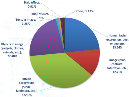 Figure 5 provides the statistics of the final question of the study, where we asked the participants to highlight the image features/information that influences their emotions and tag selection for a given image. This question is expected to provide useful information from a methodological point of view. As can be seen, the image background (i.e., scene, landmarks) has been proven the most influential piece of information for evoking people’s emotions (37.40% of the responses). Human expressions, gestures, and poses also seem very crucial (23%). Other factors, such as object-level information in images, and image color and contrast, contributed 22.48% and 12.71%, respectively.