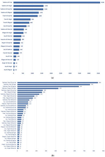Another important aspect of the crowd-sourcing study is the analysis related to how frequently different tags are used jointly. In Figure 7a,b, we show this association in pairs, and groups of three, respectively. As can be seen, sadness is most frequently used with fear, anger, and disgust. Similarly, fear is also frequently used with disgust, anger, and surprise. As for the positive tags, joy, surprise, and neutral are jointly used. A similar trend has been observed in the group of three tags.