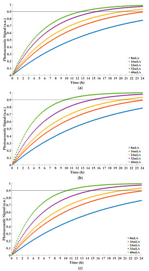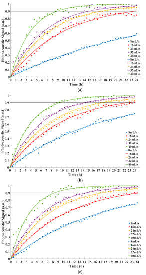 Table 3, with the increase of the feed velocity, photoacoustic signal increased faster accordingly. Therefore, the time to reach equilibrium decreased. This indicated that the performance of membrane increased with the feed velocity, which agreed with Equation (5). Additionally, the equilibrium time was hardly affected by the pressure of oil on the feed side. The results of experiment demonstrated that it could match simulation results well. Moreover, the experience of the research could also be beneficial to the application in actual scenario. The feed velocity contributed to shortening equilibrium time, but excessive feed velocity would also cause overheating problem because of the friction between oil and boundary. Furthermore, overheating oil was one of the main reasons to generate bubbles [