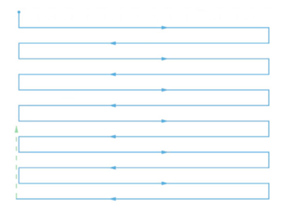 To perform 3D ROI air quality profiling, the coverage path should be designed to cover all the voxels or sampling points within an ROI as densely as possible, i.e., maximizing the coverage rate. For the common coverage path planning of an ROI in quadrotor applications, many adopt the Boustrophedon path [36,37], in which the vehicle follows an iterating back and forth path to cover the ROI, as shown in Figure 1.