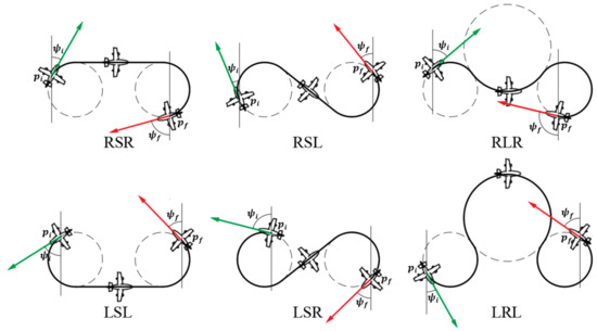 As shown above in Figure 2, represents the lift, is the mass of the aircraft, stands for the tangent velocity during turning, denotes the angular velocity, indicates the turning radius, and lastly, is the banking angle. Equation (4) then shows the minimum turning radius of a fixed-wing plane; in particular, the tangent value of the banking angle is equivalent to the ratio of the horizontal and vertical force, indicating a limitation on the turning radius . This results in low robustness in tracking the Boustrophedon paths. To resolve the low maneuverability, the Dubins path [38,39] was introduced. The Dubins path is an optimal path where the curve is in compliance with the curvature constraints at the initial and final waypoints, and it is proven to provide the shortest path for a forward traveling vehicle or robot [38,39]. Therefore, based on the Boustrophedon path, the Dubins path was added during the turning stage, so that the aircraft could have a higher tracking performance at all stages. Moreover, for the Dubins path, there exists an array of path types that are represented by , , and , indicating ‘left turn’, ‘straight’, and ‘right turn’, respectively; the turning paths are usually denoted as A visual representation is shown below in Figure 3.