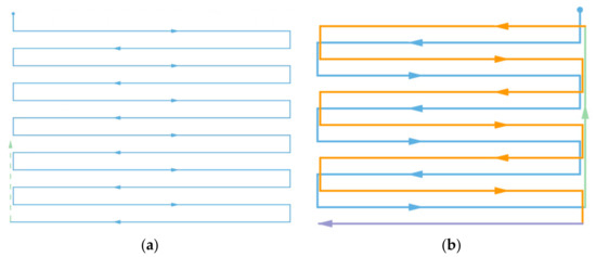 (a) Conventional Boustrophedon path and (b) the proposed cycle-Boustrophedon path.