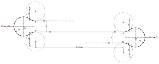 Figure 6a,b above illustrate the two aforementioned types. To perform the above, waypoints were further defined. For the LRL/RLR with the RLR, for instance as shown in Figure 7, for each turning, the following points (from a bird’s eye view) were first defined: