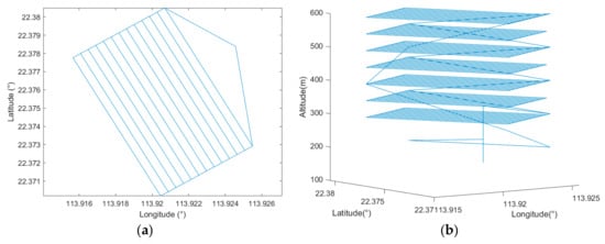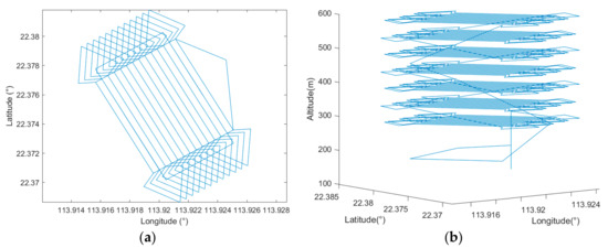 For a conventional Boustrophedon path, each parallel track is executed in series adjacently; however, in this scenario, to have a smoother turn for fixed-wing planes, we first segregated the tracks into two sub-Boustrophedon groups, even and odd orders, where they would be followed consecutively. Consequently, each level of altitude was required to complete two ‘cycles’ of paths, hence the name ‘cycle-Boustrophedon’. Figure 5a shows the original Boustrophedon method, whilst the illustration on the right (Figure 5b) displays the proposed method. Specifically, the blue, which is the ‘even order’, is first implemented, and then the paths in orange, which are the ‘odd order’, are followed. Notably, the “odd” and “even” orders refer to the horizontal path orders from top to bottom in Figure 5b. Furthermore, to fulfill the profiling density, the distance between the abutting tracks should be , making the distance between the tracks in the sub-Boustrophedon group . The proposed planning was duplicated vertically in layers, with the number of layers being n = . We believed that this addition to the conventional Boustrophedon paths would allow the fixed-wing aircraft to have a more optimal performance, since the majority of the sampling density possesses a smaller scale than the minimum radius of the UAV.