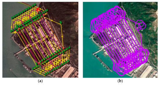 Similar to Mission Planner, an auto-grid coverage path was generated based on the same configuration. The final results show that the simulation flight took 4715.5 s to complete the mission, and the traveling distance was measured to be 94,310 m in total. Below is the bird’s eye view of the simulated flight in Figure 15b.