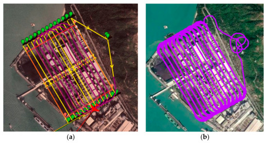 A similar result was acquired by conducting the same mission in QGroundControl, where the flight duration and distance were, respectively, 5802.8 s and 119,280 m. Figure 19b shows the results generated by the QGroundControl simulation platform.