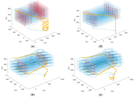 The 3D trajectory results of scenario 1 in blue lines, the not approached sampling points in red circles, and returning route in orange bold lines of (a) auto-grid paths, (b) cycle-Boustrophedon, and (c) circling-forward in simulation platform 1, and (d) auto-grid paths, (e) cycle-Boustrophedon, and (f) circling-forward in simulation platform 2.