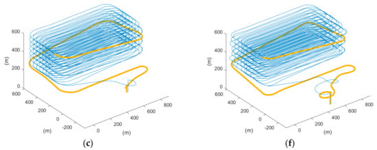 Last but not least, Figure 20 also presents the returning routes (colored in orange) of the inspection mission. In Figure 20a,d, it can be observed that different landing strategies were adopted by different firmware. With the ArduPilot firmware in platform 1, the plane flew in fixed-wing mode and spiraled down with a small radius above the home position. In platform 2, which is the PX4 firmware, the fixed-wing UAV transited into the multi-rotor mode and landed above the home position vertically. For a quad-plane configuration UAV, such design of paths could cause instability, whereas it is also propounded that such a UAV application should have a generalized landing method. Therefore, in Figure 20b–f, instead of utilizing the automated returning paths, the proposed return to launch method was integrated and showed similar results. Applying the proposed landing approach, both the descent rate and turning rate were pre-determined and secured, which also prevented divergence between different firmware. This also avoided the confusion of operators while launching UAVs in different firmware platforms and hence reduced operating error and hazard.
