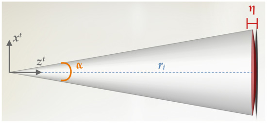 Considering the conic beam model in Figure 2, two main sources of uncertainty arise: the angular beam aperture originates a target area, which grows with respect to the slant range r, introducing ambiguity in the plane normal to the beam direction; on the other hand, the intrinsic sensor range resolution comprises the main source of measurement uncertainty along the beam direction. The 3DupIC takes these parameters into account to model each individual sonar beam i, in the beam reference frame (t), as a Gaussian random vector: . The mean is directly defined by the measured range , along the Z-axis: . In the beam reference frame, with the Z-axis passing through the center of the cone, as illustrated in Figure 2, the ith beam uncertainty is characterized by the following covariance matrix:
