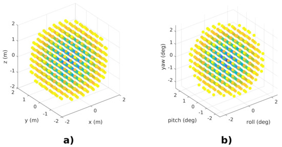 Initial perturbations introduced to (a) position states and (b) orientation states. Points are colored according to their Euclidean distance with respect to the true displacement, ranging from short distances, marked with blue, to higher distances in yellow.
