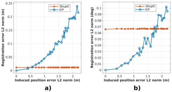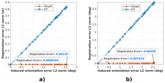 A clear difference is noticed when initial orientation errors are introduced (Figure 5). Once again, the 3DupIC consistently provides an accurate solution, whereas the ICP’s performance rapidly deteriorates as result of poor orientation initialization. This observation verifies the difficulty of the ICP algorithm to respond appropriately to relative scan misalignment. In this particular case we can argue that the ICP method diverges, since the registration error in Figure 5b is higher than the induced orientation error. Moreover, it can be concluded that by relying on the Mahalanobis distance, the 3DupIC effectively captures the orientation component conveniently.
