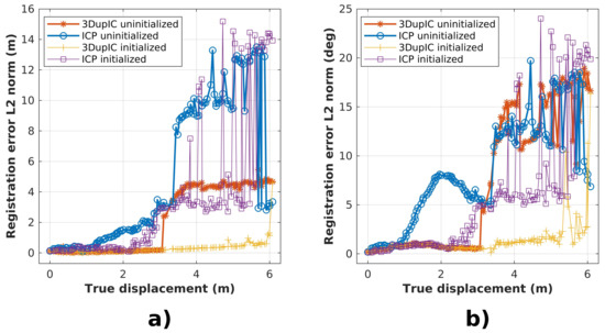 Results are compared with the ground truth to compute the registration errors, shown in Figure 6. Ideally, the registration algorithms should recover the robot displacement between the scan acquisition poses, but in practice, Figure 6 shows that as the robot displacement increases and scan overlap diminishes, the registration problem becomes harder and divergence occurs at some point. In this particular aspect, the 3DupIC demonstrates the capability to converge for longer relative scan displacements. Moreover, it can be verified that proper initialization delays divergence of both methods. Moreover, the 3DupIC provides the most accurate registration results, with satisfactory accuracy up to 5 m of displacement, which corresponds to a scan overlap of around .