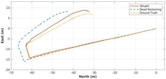 Finally, the transformation sequence obtained by registering consecutive scans, using the 3DupIC, is employed to correct the long-term robot trajectory. 3DupIC corrections are introduced in the dead reckoning’s EKF via a new update, to directly observe position and orientation states. Figure 7 provides a 2D representation of the trajectories obtained by each method, along a robot trajectory of 127 m with a total traveling time of 250 s. It can easily be observed that the integration of 3DupIC solutions contributes positively to reduce dead reckoning drift, as the 3DupIC aided trajectory closely follows the ground truth. At a certain point, around −60 m north and −5 m east, several successive divergences of the 3DupIC are noticeable. They are mainly caused by the flat underwater terrain in that area, which provides insufficient information to support scan matching.