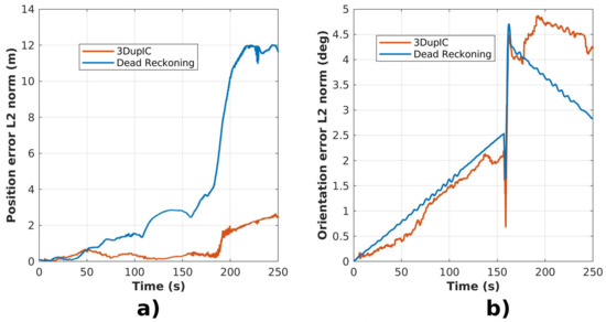 In terms of orientation, at first glance, the impact of 3DupIC contribution is not so striking, since the error follows the dead reckoning tendency, as demonstrated in Figure 8b. Nonetheless, until the robot changes direction, around timestamp 160 s, the 3DupIC presents a slight lower error signature than the dead reckoning. After inverting the direction of motion, despite the higher error of the 3DupIC solution, we can argue that it is more stable than the dead reckoning, and hence more consistent, indicating the ability of the registration method to track the robot orientation with higher precision.