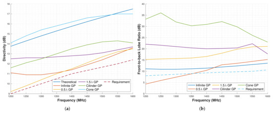 Comparing the results for the D, several conclusions can be drawn. Regarding the GP, it can be seen that it does not maximize the D, since other smaller GPs can provide even higher Ds. Regarding the square GP, the D is lower for low frequencies and equal to the infinite GP for higher. For the 1.5 GP, the D is higher than for the GP. The cylinder has higher D for frequencies above 1300 MHz is even higher than for the 1.5 . Finally, the conical GP has even more D than the theoretical one.