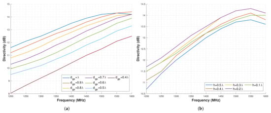The results for these analyses are shown in Figure 8a,b, being the first sweep in and the second in h. For the case of the , it can be seen that as D reduces, the GP size is also reduced. For the specific case of , the D is decreased by approximately 3 dB in all bands with respect to the maximum D. For , the highest D is obtained, and for , D decreases approximately 0.5 dB.