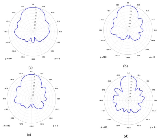 - Cylindrical cup ground plane: This plane should provide more D than the square GP. According to [32], the optimum dimensions are and (Figure 6d).