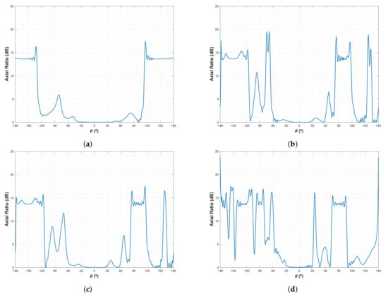 Axial ratio measured in an Anechoic Chamber from the NADS Flight Model. (a) Axial ratio at 1227.6 MHz. (b) Axial ratio at 1400 MHz. (c) Axial ratio at 1427 MHz. (d) Axial ratio at 1575 MHz.