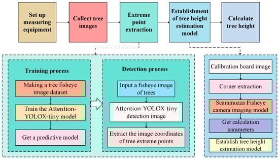 Tree extrema are defined as the highest and lowest points of a tree. The improved YOLOX-tiny object detection network can detect the complete tree and extract tree extreme points. After that, the extracted extreme points are brought into the tree height estimation model to calculate the tree’s height. The general flow chart for estimating tree height is shown in Figure 2.