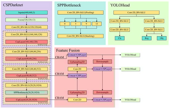 In this study, embedding the CBAM module keeps the original YOLOX-tiny structure (Attention-YOLOX-tiny). The network structure of Attention-YOLOX-tiny is shown in Figure 3.