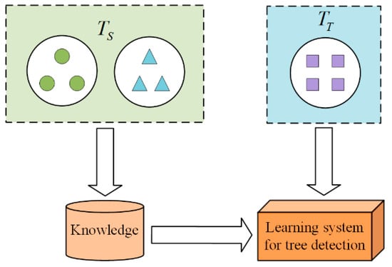 To obtain better detection results, the transfer learning method is used to load the pre-trained model [30]. The learning model needs to learn related source tasks on the source domain and then transfer the knowledge to the target task on the target domain to improve the model’s performance on specific tasks. Given the source domain () and the source task (), the target domain () and target task (), the knowledge acquired, and help the model solve the prediction function () of on . The transfer learning process is shown in Figure 4.