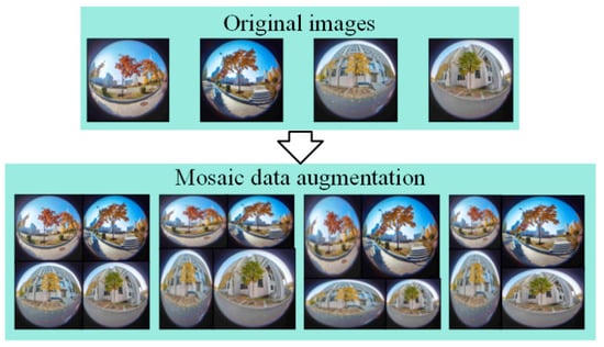 During the training process, mosaic data augmentation is used to augment the dataset. Mosaic data enhancement refers to reading four pictures at a time, flipping, scaling, and changing the color gamut of the four pictures, respectively. Then, it positions according to the positions of the four directions and combines the pictures and frames. The mosaic data enhancement method is shown in Figure 5.