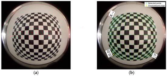 Checkerboard and corner extraction. (a) Fisheye image; (b) Corner extraction.